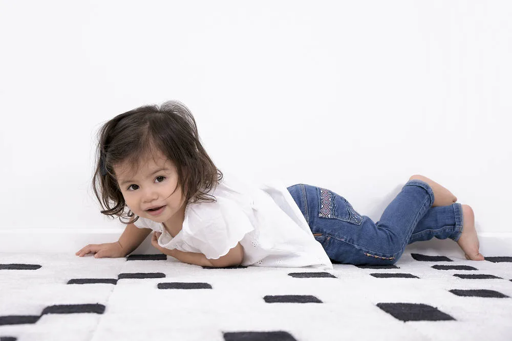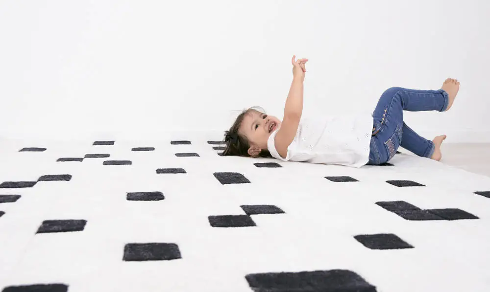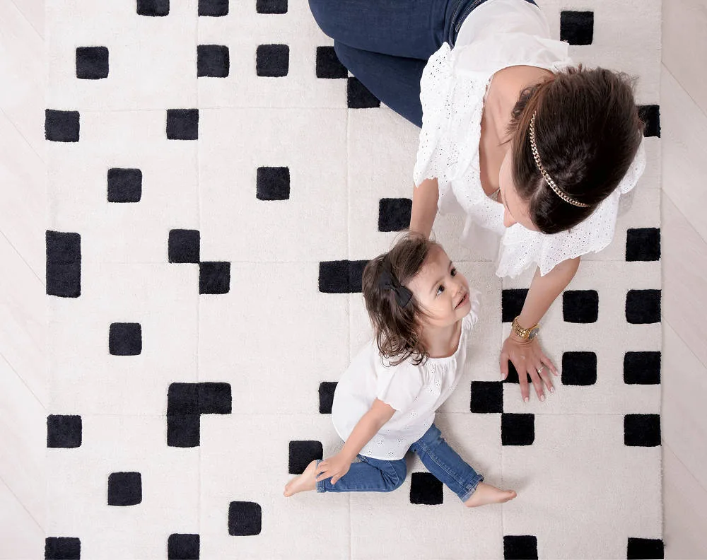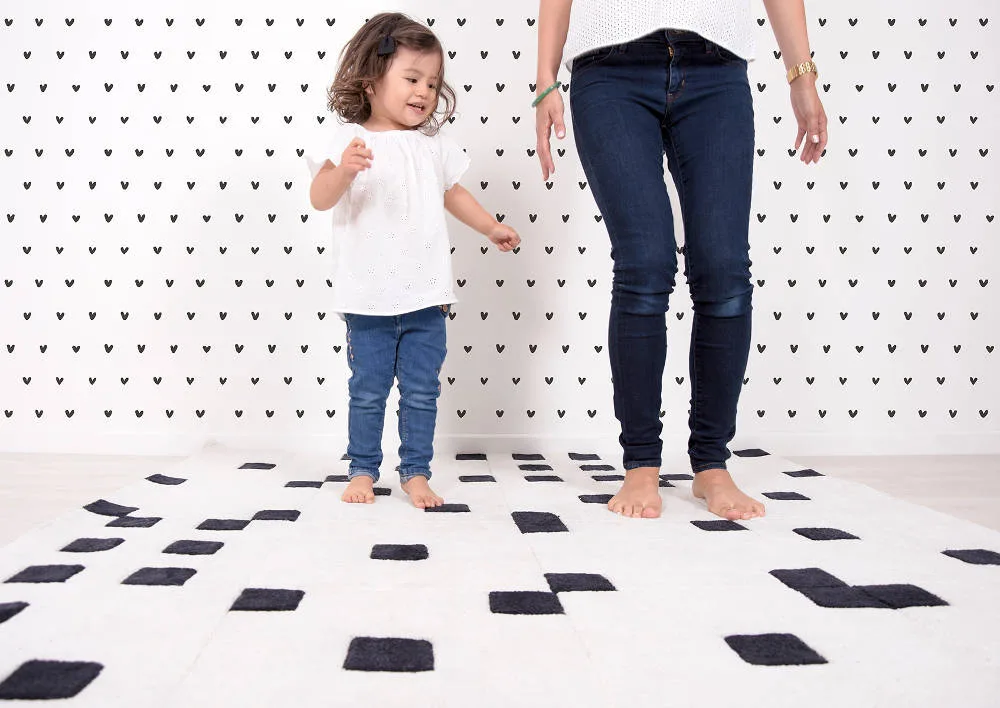 Prachtig groot vierkant vloerkleed van maar liefst 150×150 cm. Er zit een reliëf in het vloerkleed dat het tapijt verdeelt in allemaal vierkantjes. Daarnaast heeft het ook nog een patroon van zwarte vierkantjes. Je kunt je wel voorstellen dat een kinderfantasie hier gelijk mee aan de haal gaat en dat het design uitnodigt tot de meest inventieve spelletjes! Bovendien is dit tapijt superzacht en heerlijk voor de blote voetjes. Dit kindervloerkleed heeft een dikte van maar liefst 1,5 cm en is van zeer hoge kwaliteit, zoals we van Lilipinso gewend zijn. Het is gemaakt van 100% getuft katoen en heel zacht en comfortabel. Dit tapijt is een echte eye-catcher op de kinderkamer, babykamer of speelhoek. En bovenal uren speelplezier gegarandeerd!