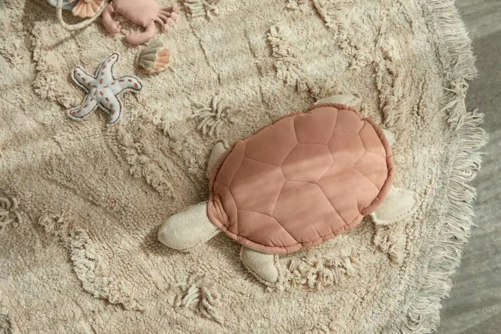Duik in de magische onderwaterwereld SEA WONDERS en ontdek deze kleurrijke, speelse en leerzame collectie van Lorena Canals. Schattig handgemaakt kussentje in de vorm van een zeeschildpad. Het zachte katoenen kussen is vrij van chemicaliën en heerlijk om mee te knuffelen en spelen. Het kan ook in de wasmachine, dus super praktisch! Let op de mooie details in het kussen zoals het gecapitonneerde schild, het gebruik van verschillende katoenen stoffen en de natuurlijk afgesneden canvas poten, kop en staart. Tover de kinderkamer om tot een oceaanbodem en vul hem met magische oceaanwezens! Maak je eigen onderwaterwereld compleet en combineer met de andere artikelen uit de collectie!