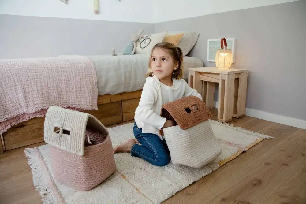 Prachtig met de hand gemaakte katoenen mandje in de vorm van een huis. Deze decoratieve mand komt uit de Eco City collectie van Lorena Canals en is beschikbaar in 2 kleuren. Erg leuk om speelgoed of ‘schatten’ in op te bergen!