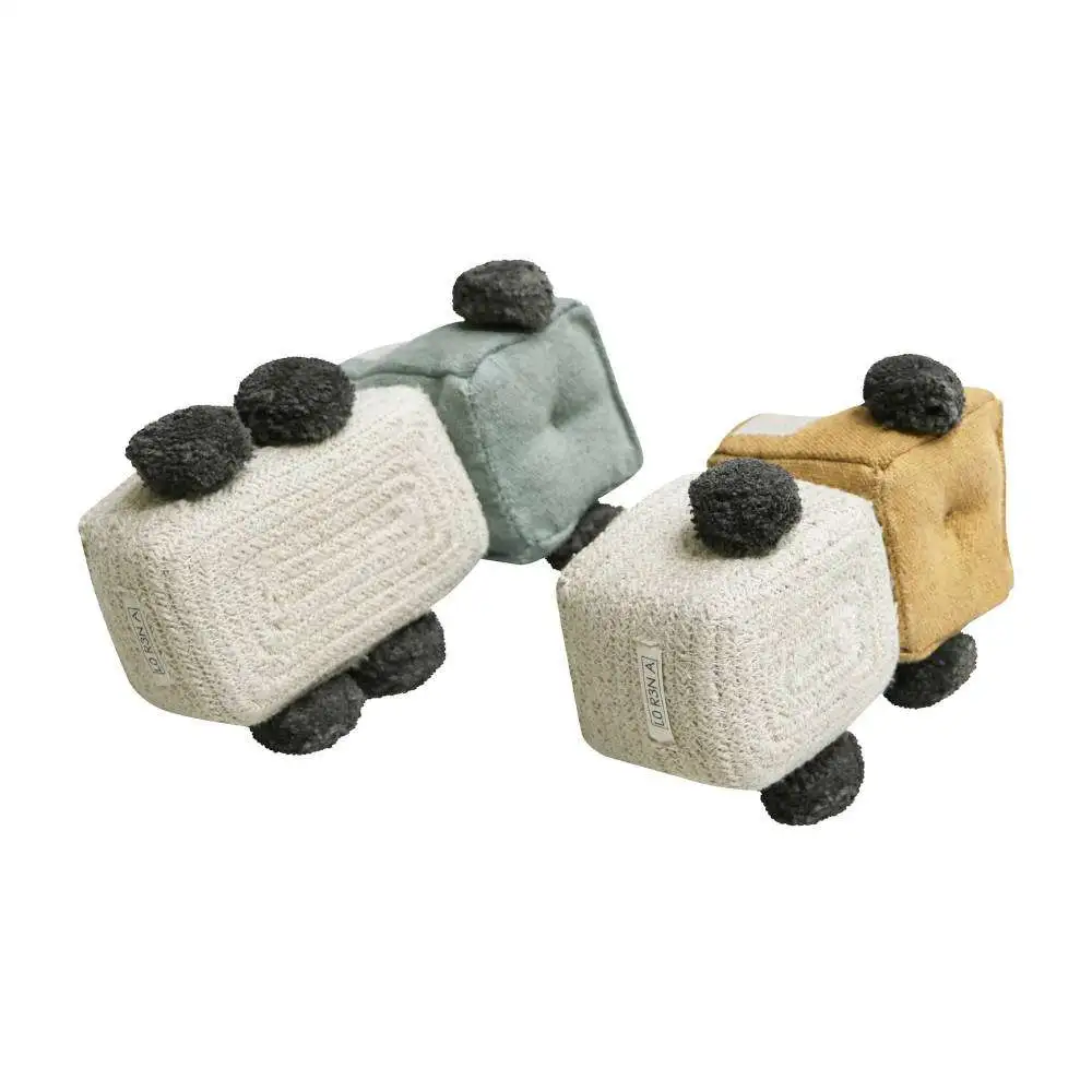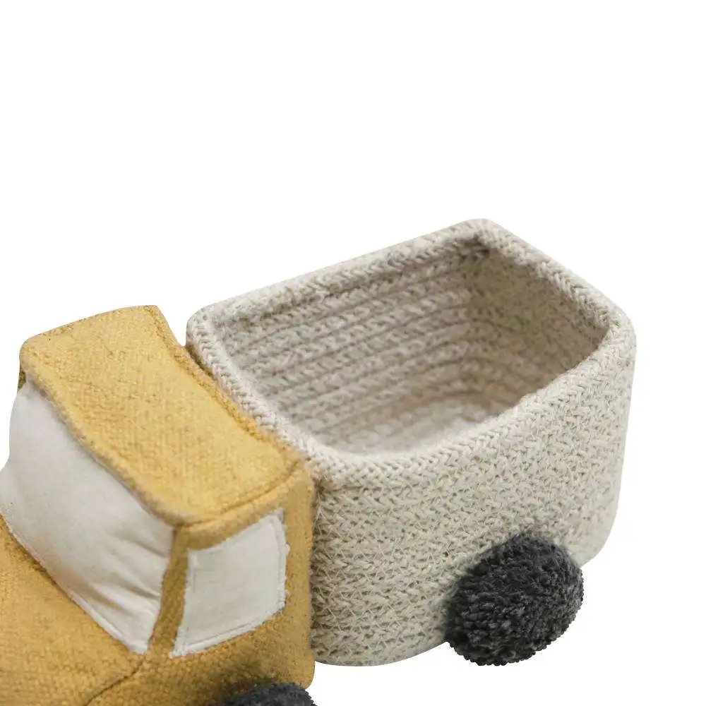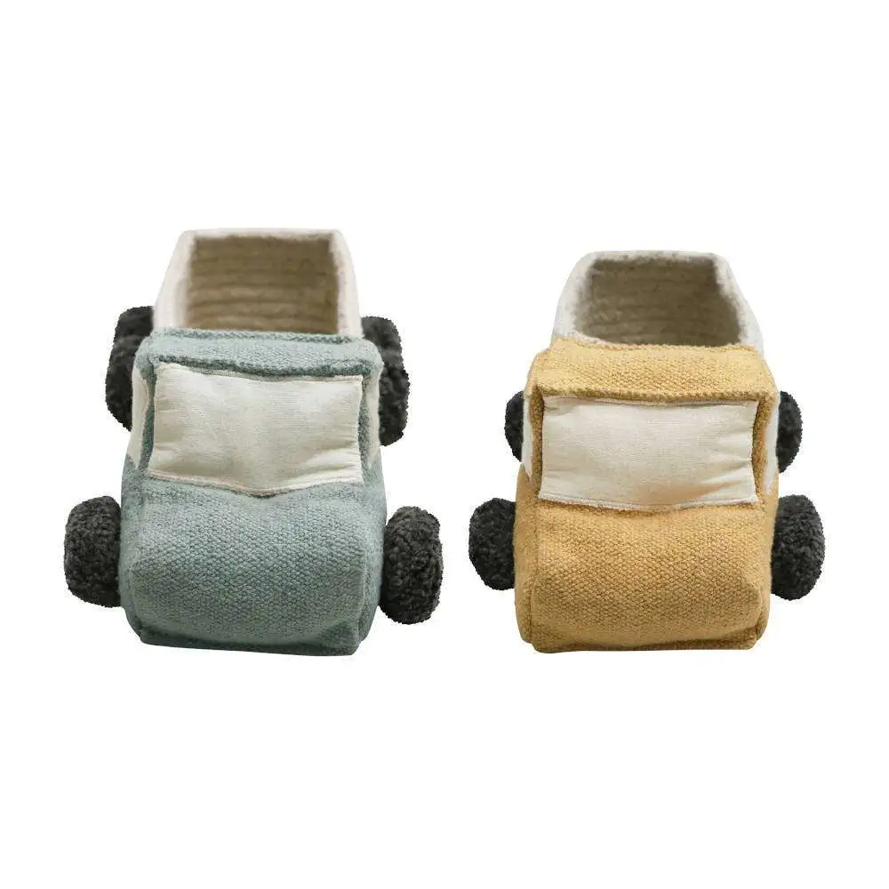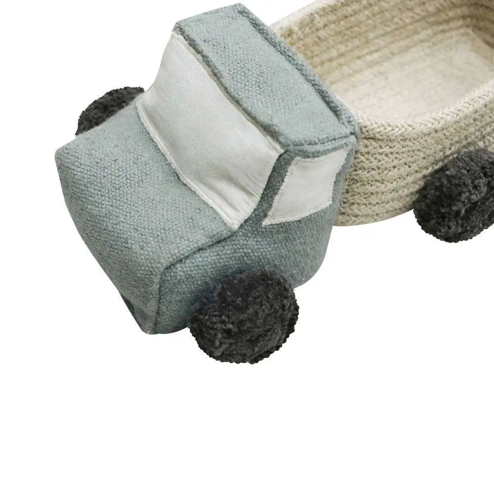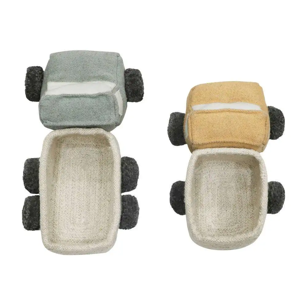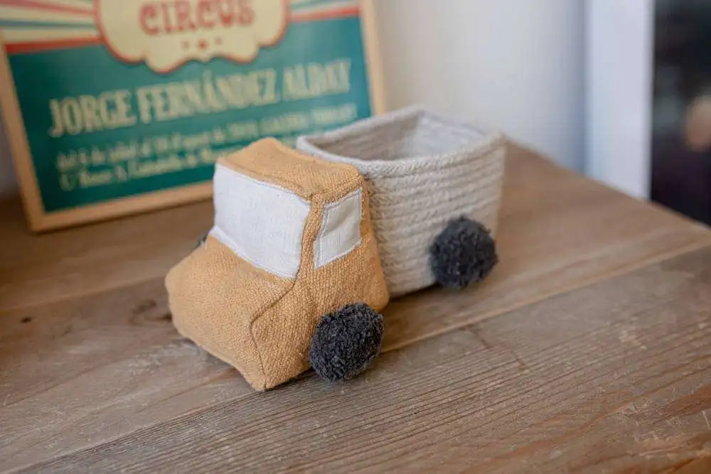 Prachtige katoenen mandjes in de vorm van vrachtwagens uit de Eco City collectie van Lorena Canals. Deze met de hand gemaakte mandjes zijn gevlochten van katoenen koorden, de vrachtwagencabines zijn gemaakt van katoenen canvas en ze hebben katoenen pom poms als wielen. Erg leuk om speelgoed of ‘schatten’ in op te bergen of om gewoon mee te spelen!