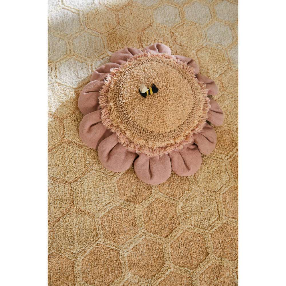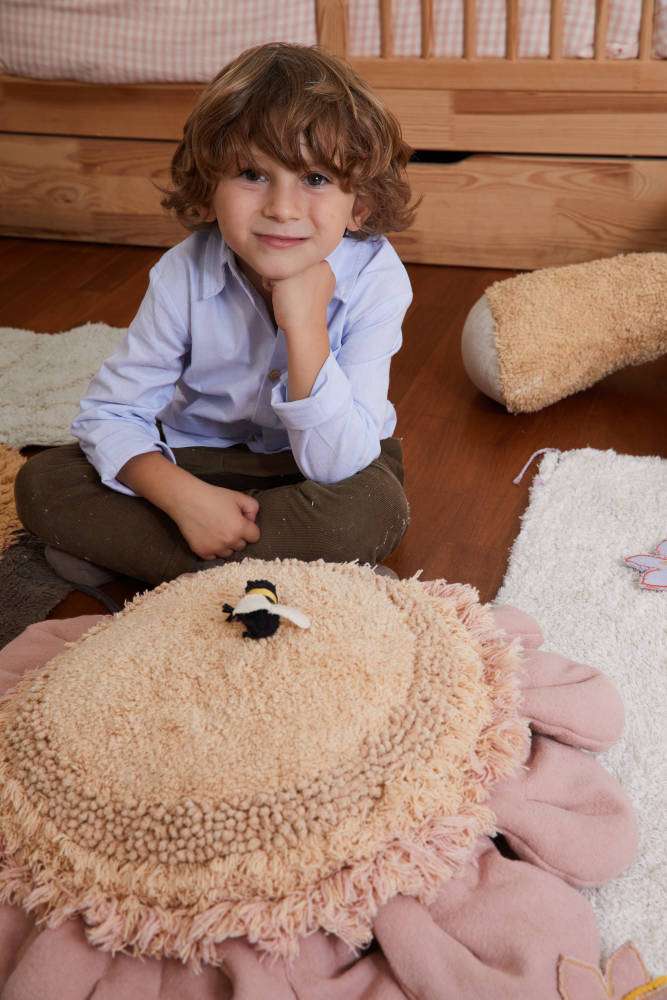 Super fijn vloerkussen Pink Daisy is een lekker royaal sierkussen in de vorm van een roze madeliefje. Dit kussen heeft fantastische details zoals een getuft middenstuk in goudgele katoenen chenille met langere en dikkere strengen om het gestructureerde oppervlak van het bloemhart te creëren. De grote roze bloemblaadjes van katoenen canvas rondom het kussen maken het helemaal af. Gevuld met zachte polyester vulling. Het zachte katoenen kussen is vrij van chemicaliën en heerlijk om mee te knuffelen en spelen. Het kan ook in de wasmachine, dus super praktisch! Maak je eigen ‘Planet Bee’ compleet en combineer met de andere artikelen uit de collectie!