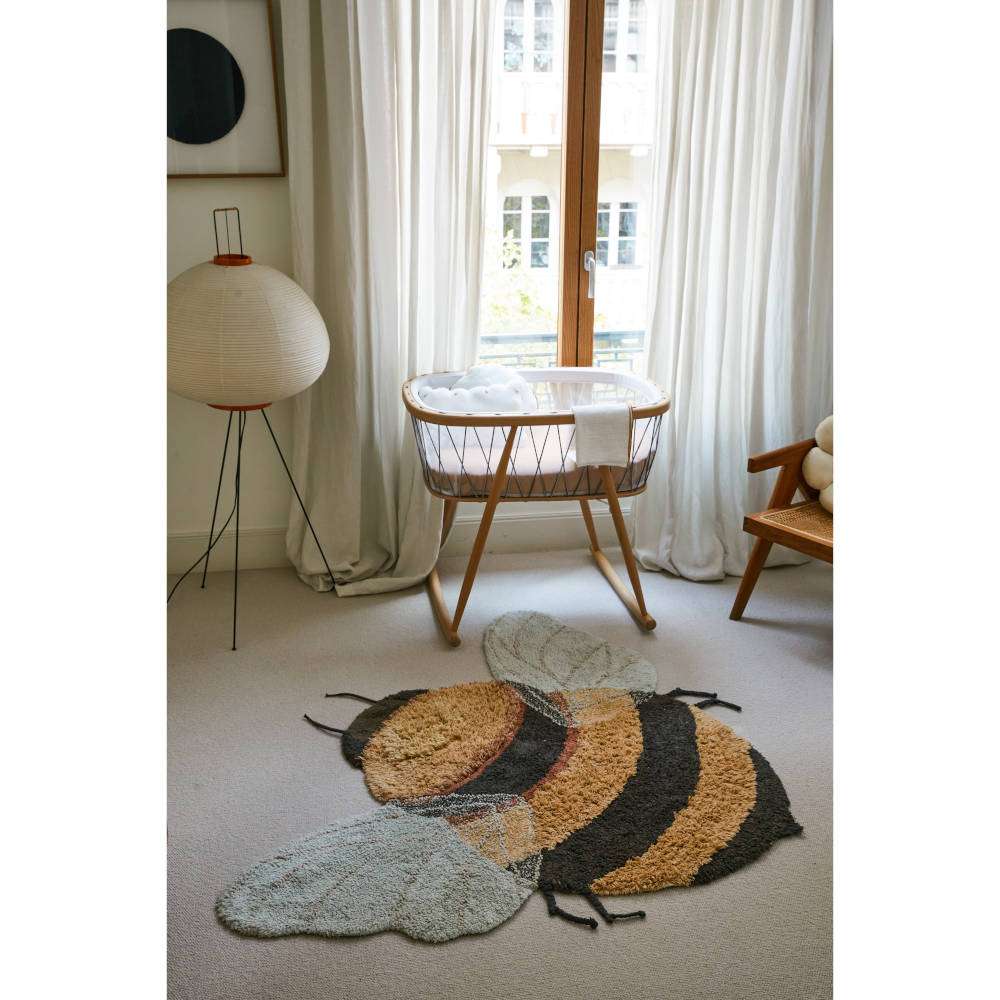 Wasbaar vloerkleed Bee in de vorm van een lieve bij uit de collectie PLANET BEE. Dit vloerkleed is niet alleen een eye-catcher in de kamer, maar is ook de perfecte metgezel om de fascinerende rol van bijen op onze planeet te verkennen en ontdekken. Een bijensilhouet met een gestreept lichaam in honing- en donkergrijze kleur en vleugels in lichtblauw. Een deel van de bij is extra donzig en heeft een langere pool. De vleugels zijn subtiel met de hand vervaardigd om een transparant effect te creëren. Afgewerkt met donkergrijze koorden als voelsprieten en zorgvuldig gevlochten donkergrijze poten. Een tijdloze eye-catcher voor in de kinderkamer, speelhoek of elk ander plekje in je huis. Dit vloerkleed zal niet alleen prachtig staan, maar ook het gevoel van zorg en bescherming van de natuur opwekken met als boodschap: