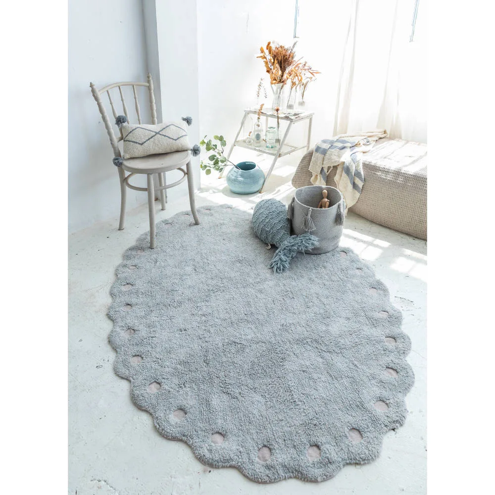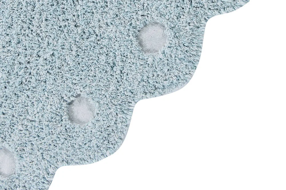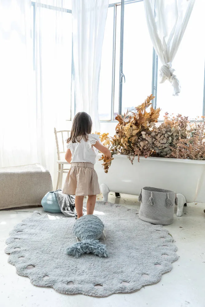 Dit prachtige vloerkleed ‘Pearl Blue’ is geïnspireerd op de vorm van een dennenappel! Het kleed is handgemaakt en komt uit de nieuwste collectie ‘Cotton Woods’ van Lorena Canals. Dit wasbare vloerkleed heeft ronde uitsparingen aan de rand, waardoor de canvas basis zichtbaar wordt.