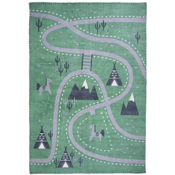 Prachtig met de hand geweven vloerkleed met een stonewashed print van een prachtig Wild Westen tafereel in een vergrijsd groene kleur. Een speelkleed met een autoweg dwars door het Wilde Westen met een ruig landschap vol met Indianen tipi’s, cactussen, ruige bergen en paarden. Pak je autootjes en speeldieren er maar bij! Deze eyecatcher voor op de kinderkamer is met de hand geweven van 100% katoen, geprint en gestonewashed. Daardoor heeft het kleed een stoere en geleefde uitstraling. Dit rechthoekige kindervloerkleed van Nattiot staat geweldig in de babykamer, kinderkamer of speelhoek en het zal de ruimte helemaal af maken! In een mum van tijd maak je van elk stukje lege vloer een knusse plek!