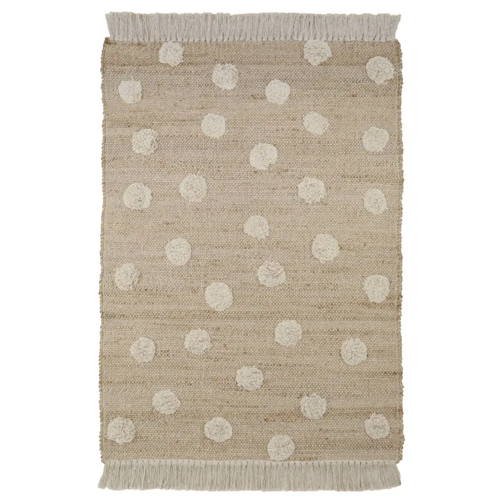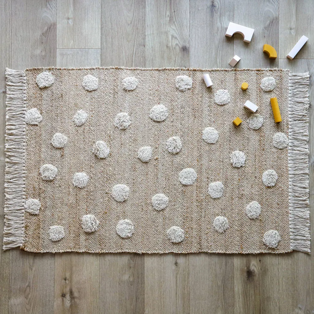 Prachtig vloerkleed van een jute-katoen mix met vrolijke stippen en franjes. Met de hand geweven in India waar zij gespecialiseerd zijn in deze techniek! Dit vloerkleed is gemaakt van onderhoudsvriendelijke vuilafstotende natuurlijke materialen met het Oeko-Tex label. Het heeft een authentieke natuurlijke uitstraling. Wat een eyecatcher! Dit prachtige kleed van Nattiot staat geweldig op de babykamer, kinderkamer of je eigen slaapkamer en het zal de ruimte een eigen unieke en warme sfeer geven!