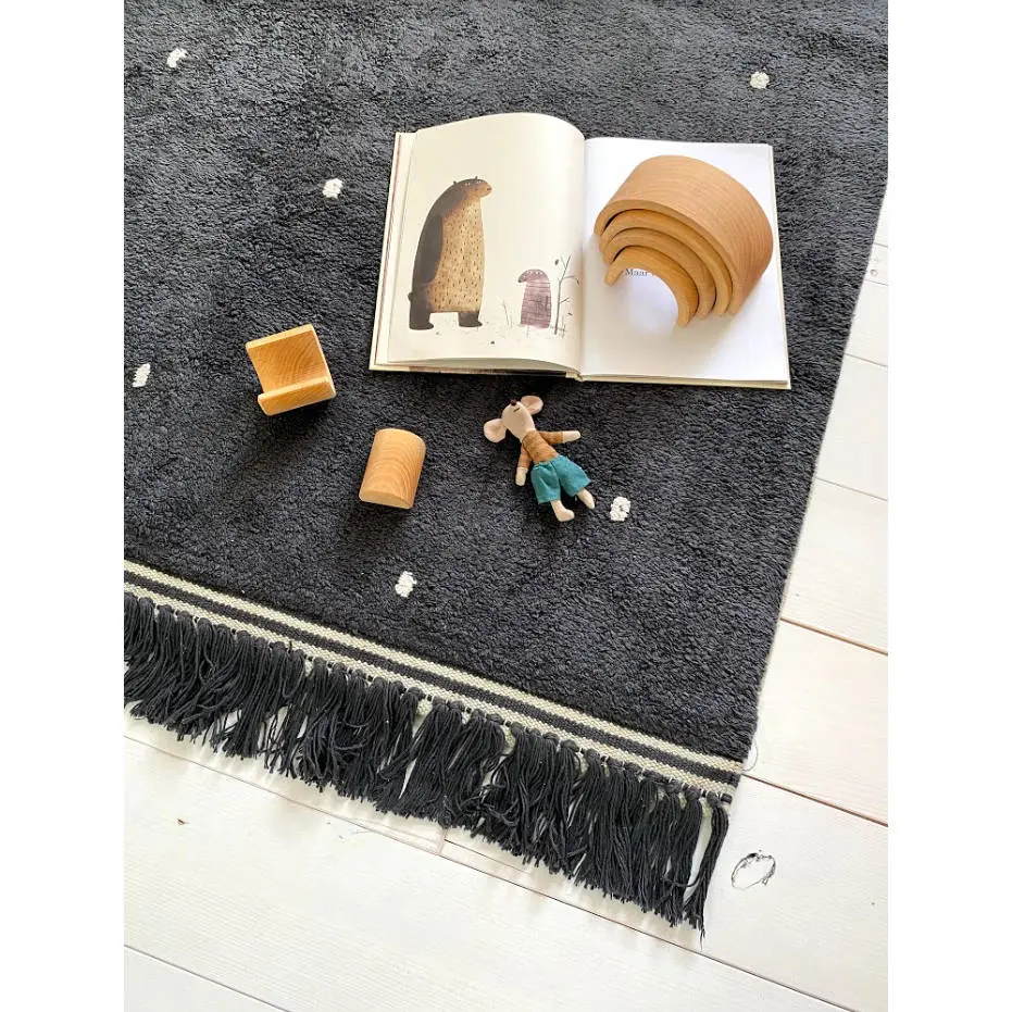 Heerlijk zacht hoogpolig vloerkleed Emily Dot Antracite is van een prachtige kwaliteit. Dit vloerkleed in een donkere kleur antraciet heeft speelse witte stippen. De vrolijke bies met franjes geeft dit tapijt nog meer karakter. Je kunt alle kanten op met dit tijdloze vloerkleed met neutrale kleur en uitstraling. Dit met de hand gemaakte tapijt van 100% getuft katoen is zo zacht dat je er heerlijk op kunt kruipen, liggen en spelen. Het staat prachtig op de babykamer, kinderkamer of speelhoek en geeft de ruimte meteen warmte en sfeer! Maar dit vloerkleed staat eigenlijk overal in huis geweldig!