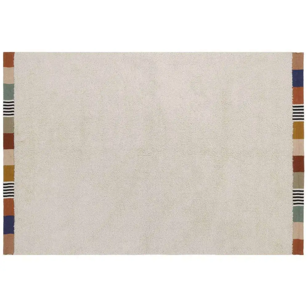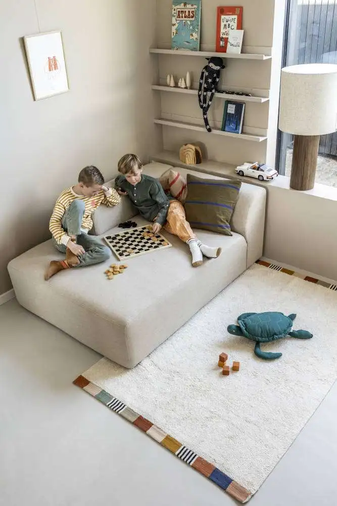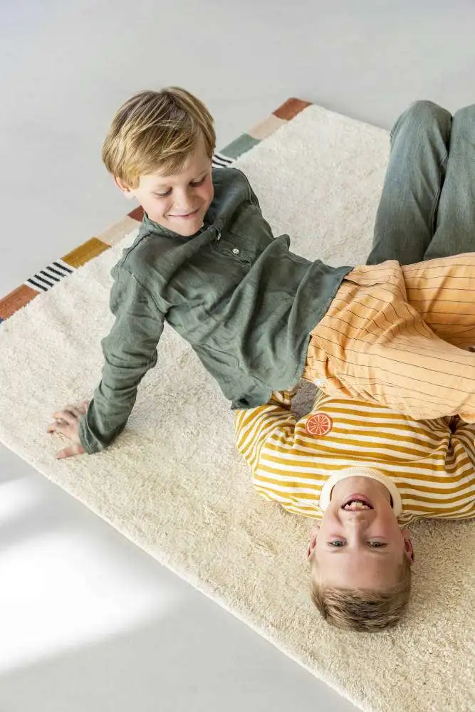 Lekker zacht vloerkleed Guus is van een prachtige kwaliteit. Dit gave vloerkleed in een lichtbeige kleur heeft een speelse bies met verschillende kleurvlakken en geeft het nog meer karakter. Je kunt alle kanten op met dit tijdloze vloerkleed met neutrale kleur en uitstraling. Dit met de hand gemaakte tapijt van 100% getuft katoen voelt lekker warm en comfortabel en je kunt er ook heerlijk op kruipen, liggen en spelen. Zo ontzettend leuk voor in de babykamer of kinderkamer. Maar ook in bijvoorbeeld een speelhoek geeft het de ruimte meteen warmte en sfeer! Tapis Petit werkt met duurzame en Oeko-Tex gecertificeerde materialen en alle vloerkleden zijn met de handgemaakt.
