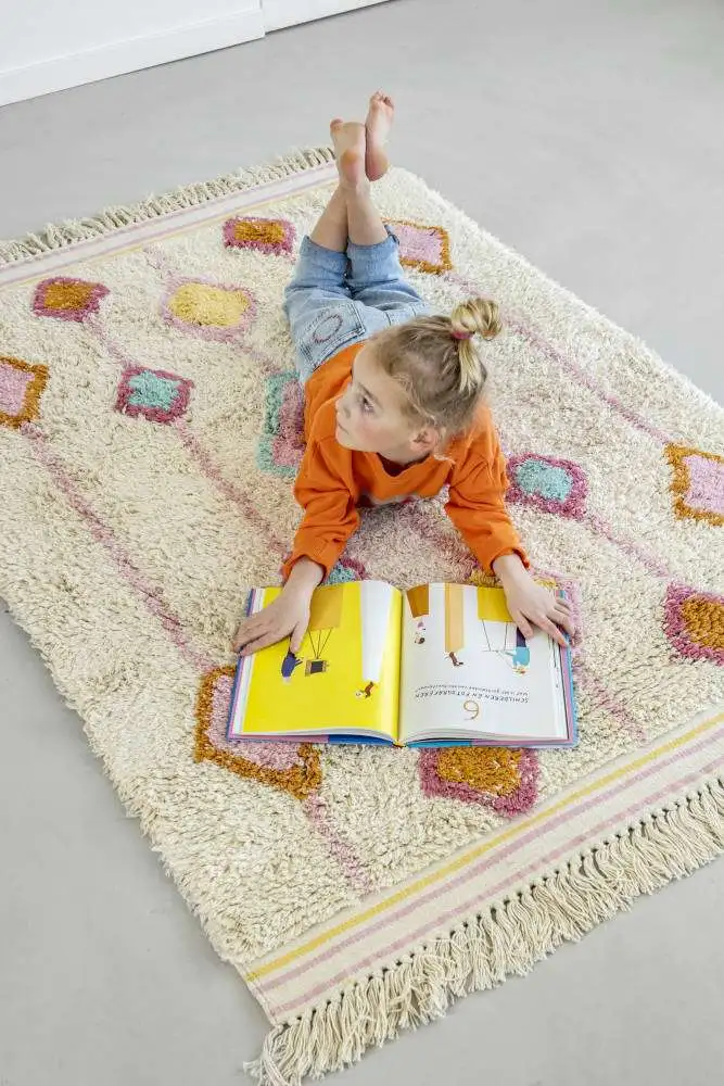 Vloerkleed Lea is een hoogpolig vloerkleed van een prachtige kwaliteit met de hand gemaakt van 100% getuft katoen. Het vloerkleed heeft speelse ruitjes en strepen in de kleurencombinatie, roze, blauw, rood, geel en oranje. Het vrolijke patroon, de gekleurde bies en de franjes aan de uiteinden geven dit tijdloze tapijt karakter. Het geeft de babykamer, meisjeskamer of kinderkamer meteen warmte en sfeer. Maar dit vloerkleed staat eigenlijk overal in huis geweldig! Tapis Petit werkt met duurzame en Oeko-Tex gecertificeerde materialen en alle vloerkleden zijn met de handgemaakt.