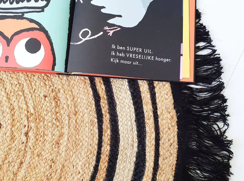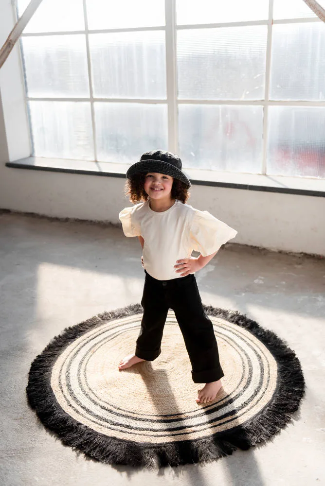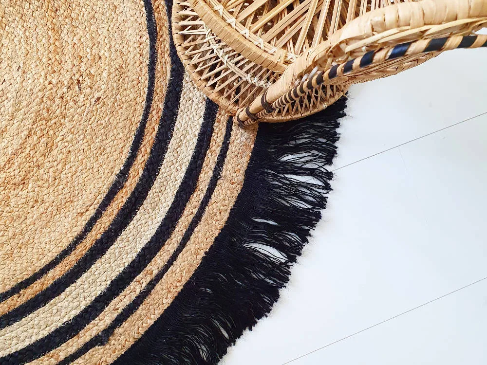 Super hip vloerkleed met franjes van 100% jute. Dit tapijt zal niet snel vervelen en is perfect te combineren met de rest van het interieur. Een echte eye-catcher is dit natuurlijke jute tapijt met prachtige zwarte accenten! Heel leuk in de kinderkamer, babykamer of bijvoorbeeld de woonkamer. Dit vloerkleed geeft de ruimte meteen warmte en sfeer!
