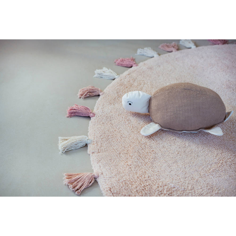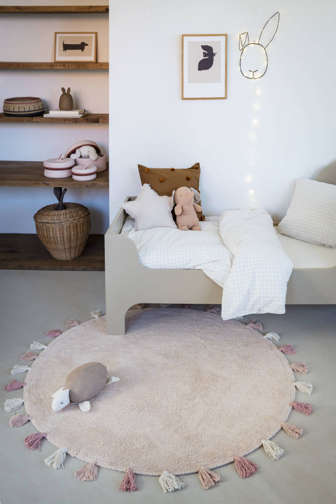Prachtig groot rond vloerkleed in een mooie zachtroze kleur. Handgemaakt en speciaal ontworpen om een speelse en zachte sfeer te creëren in de meisjeskamer. De speelse kwastjes aan de rand, in zachte tinten roze en beige, geven deze eyecatcher nog meer karakter! Het met de hand gemaakte tapijt is gemaakt van gerecycled katoen en is dus ook nog eens een duurzame en milieuvriendelijke keus! Vloerkleed Sara Pink voelt lekker warm en comfortabel aan en je kunt er ook heerlijk op spelen. Zo ontzettend leuk voor in een meidenkamer. Maar ook in bijvoorbeeld een speelhoek geeft het de ruimte meteen warmte en sfeer! Tapis Petit werkt met duurzame en Oeko-Tex gecertificeerde materialen en alle vloerkleden zijn met de hand gemaakt.