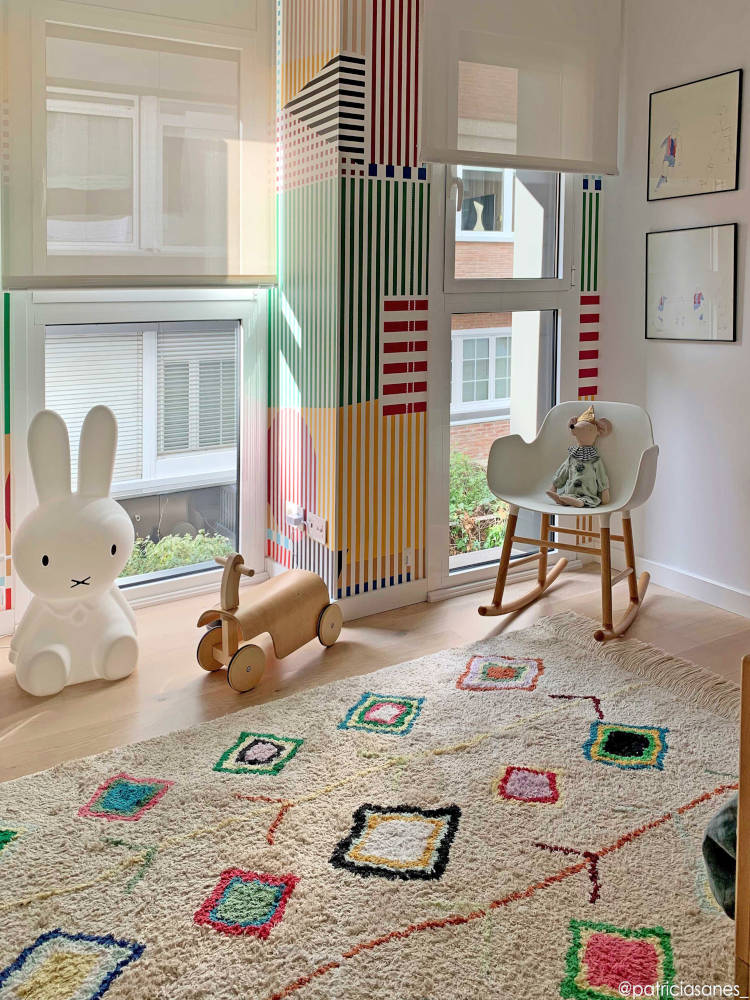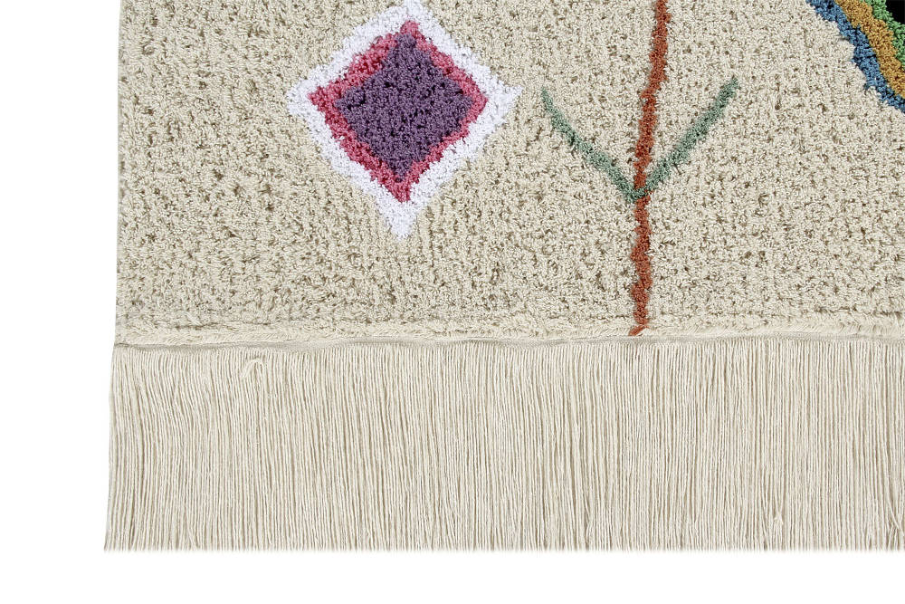 Prachtig mooi groot handgeknoopt vloerkleed uit de serie ‘Morocco’ welke is geïnspireerd op de kleurrijke Marokkaanse Berber kleden. Deze variant is uitgevoerd in een warme beige kleur in combinatie met een kleurrijke print in mooie aardse kleuren. Het kleed is heerlijk zacht en je kunt er lekker op kruipen, liggen en spelen. Het geometrische patroon, de warme kleuren en de franjes aan de uiteinden geven dit hoogpolige tapijt karakter. Dit tijdloze vloerkleed van Lorena Canals staat prachtig op de babykamer of kinderkamer. Ook staat het heel goed op een ander plekje in je interieur en geeft het de ruimte meteen warmte en sfeer. Heel gaaf ook op een ‘boho’ kamertje!
