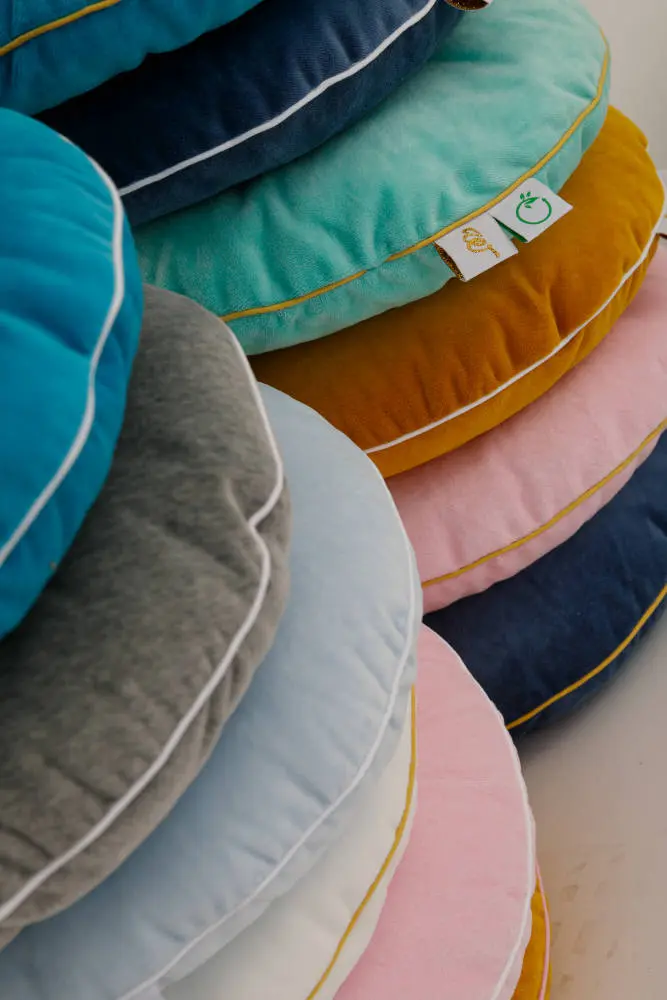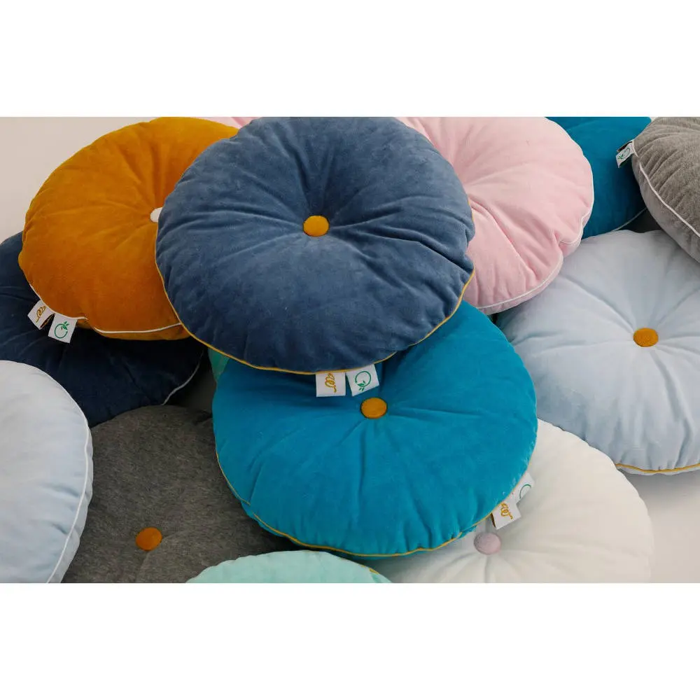 Super mooi en zacht rond kussentje met een mintgroene velvet hoes en een witte bies en knoop in het midden. Staat heel gezellig en is een echte eyecatcher op de kinderkamer of speelhoek. Heel fijn te combineren met alle andere items van Wigiwama of combineer ze met je eigen kussencollectie!