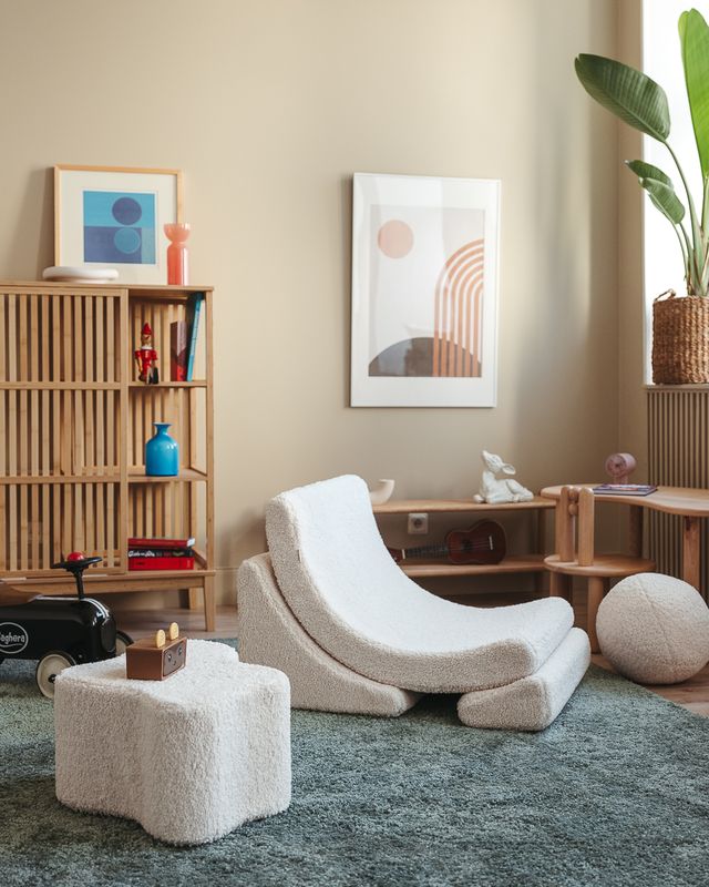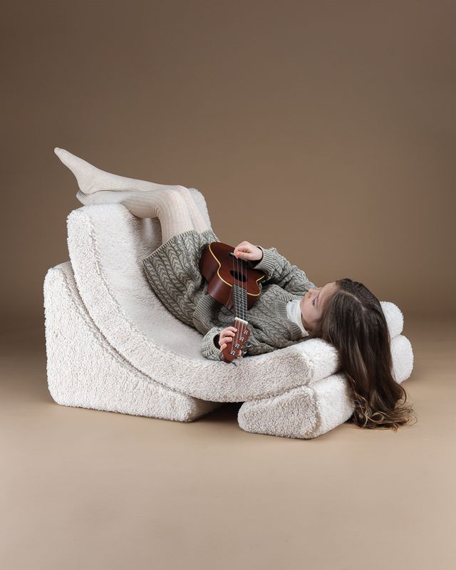 Met zijn modulaire karakter, zachte teddy bekleding en elegante off-white tint is deze kinderstoel een subtiele blikvanger die design, comfort en speelplezier harmonieus samenbrengt.