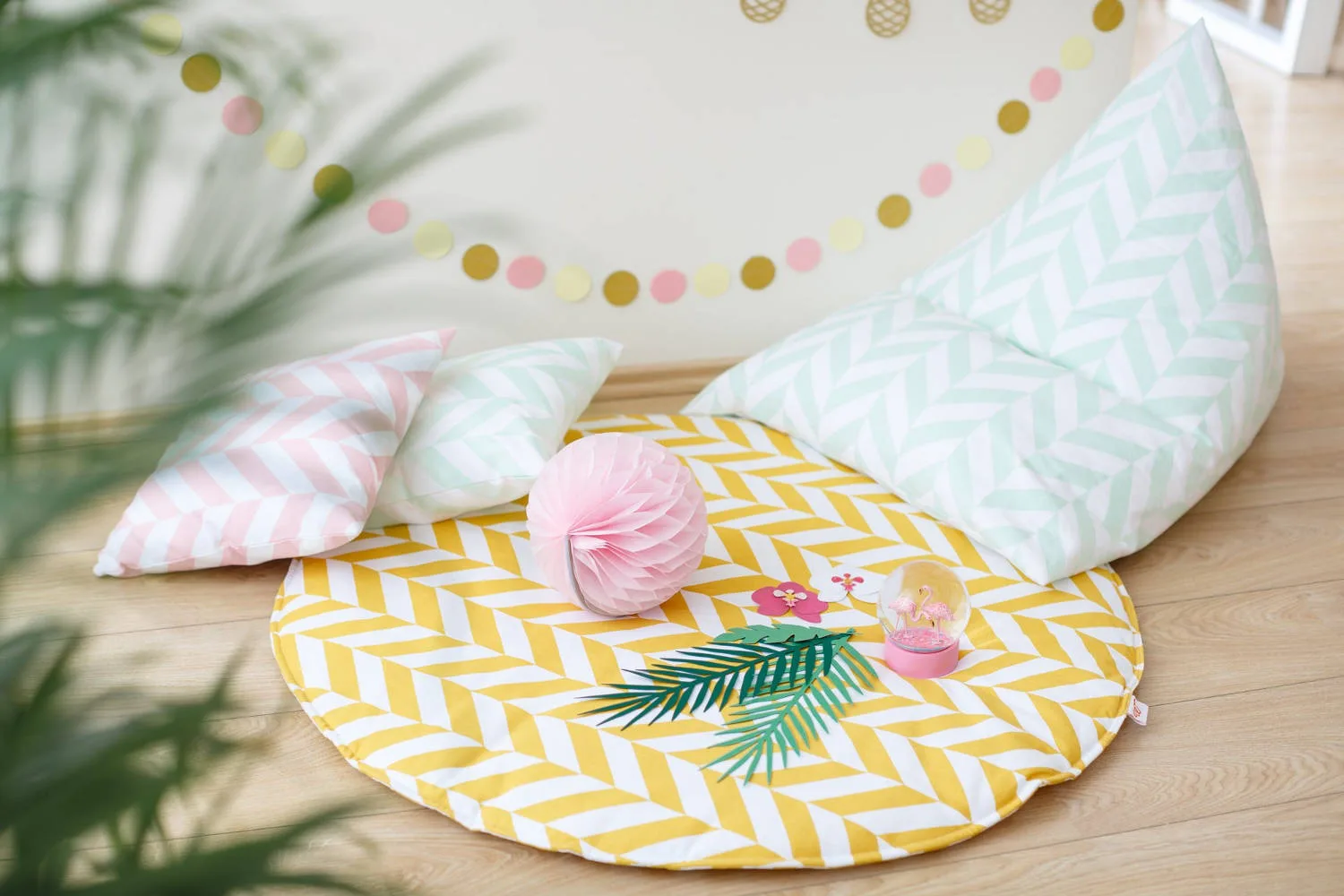 Speelmat Herringbone is verkrijgbaar in de kleuren Mustard, Pink en Mint. Leg ze neer waar je wilt en creëer een heerlijke, veilige speel- of relaxplek in elke ruimte van je huis. De speelmat is dubbelzijdig te gebruiken, dus heb je een vlekje dan draai je ‘m om, scheelt weer een wasje 😉.